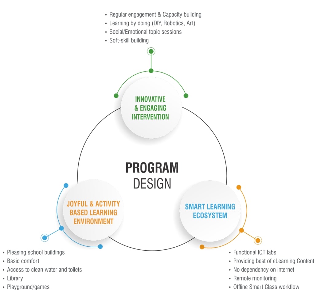 Starting from infrastructure to the e-learning content accessed by teachers and students, the foundation works closely and looks after the developments made. The program uses different tools to drive the learner’s curiosity like Tinkering and Robotics Kits, access to Smart Learning Ecosystem with no dependency on the internet which is complemented with a Joyful & Activity Based Learning Environment by setting up libraries as well as providing sports facilities. The program has been executed in 97 schools, 5 major states (Karnataka, Maharashtra, Gujarat, Rajasthan, Bihar) of the country benefitting more than 40,000 beneficiaries every year since 2019.